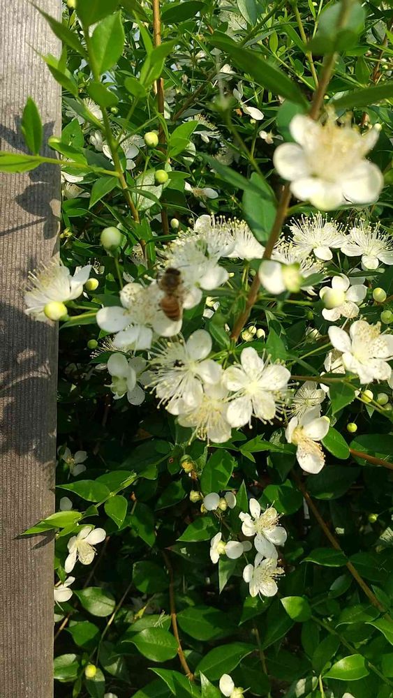玄関前に ほぼ満開のミルトス(銀梅花)の白い小花サンたちが ほんのり独特な香りを漂わせてくれています…☔️雨の日も 出入りの時に触ると、手に残る芳香が 癒しを与えてくれます…🌿この花の蜜を集めているミツバチサン🐝…どんな味の蜂蜜が できるのかなぁ~✨🍯✨笑