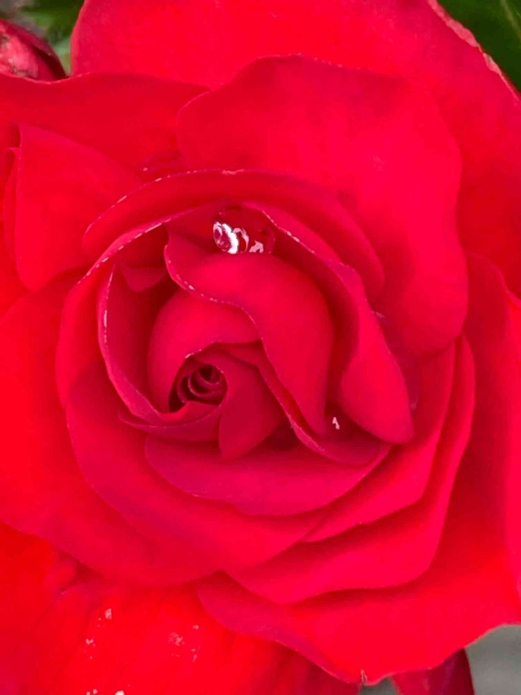 真っ赤な球根ベゴニアの花びらの中にキラリと美しく光るものが… ダイヤモンドかしら〜?