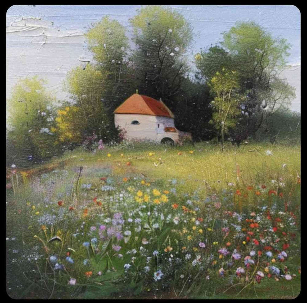 10K,高品質,写実的,油絵, アンナ・ピーターズ, 向こうにコテージがある銀行の野生の花,花の風景画
