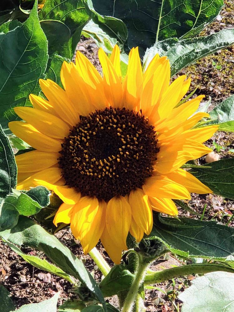 お散歩途中 丈は50センチくらいなのに大きな花を咲かせていたヒマワリに出会いました🌻