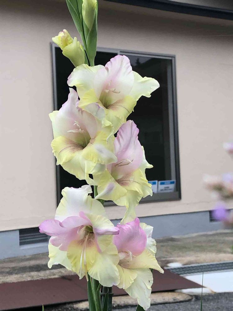 優しい色のグラジオラス咲きました💕今年は少しピンクが薄い 裏はお家買取りのカ○○ス リフォーム後 なかなか売れません
