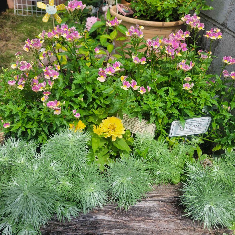 寄せ植えにしてたのを花壇に植え替えたネメシアがモリモリ⤴️アサギリソウもフサフサ⤴️ジニアはダンゴムシに食べられてなかなか大きくならない💦