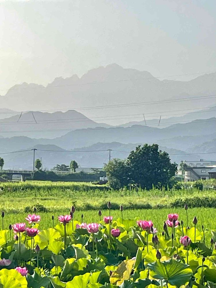 山を背景にハスのお花…素敵だね🩷