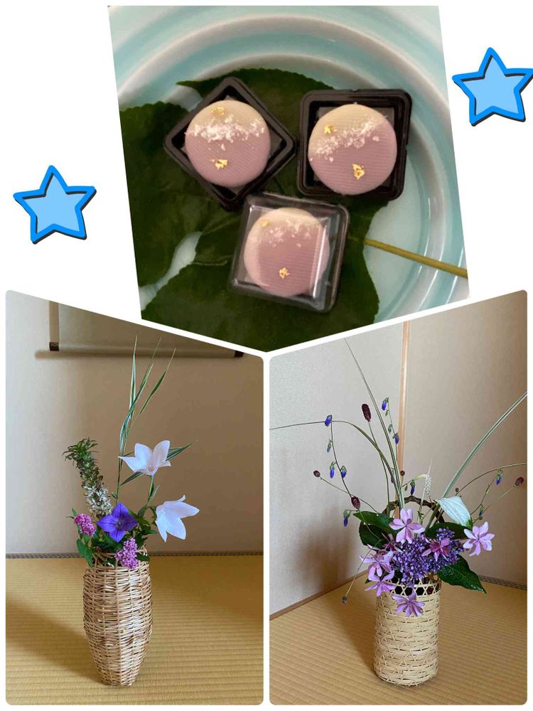 右は水曜お稽古のお花ソバナ 吾亦紅 紫陽花 ハンゲシヨウ シマススキ 有馬籠せせらぎに(有馬温泉で求めた)