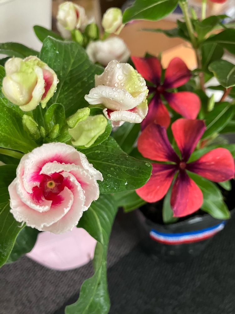 カップ咲き こんなピンカあるのね〜🩷これがミキ♡で赤いのが名無しのニチニチソウ なの❓前に優しいピンクのピンカもあったね〜💓💓寄せ植え楽しみ〜🙋♀️🎵