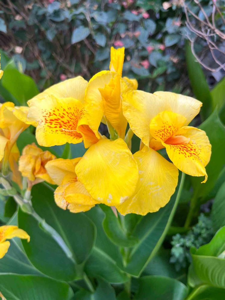 真夏になるとさんぽしていても見かける花がグッと減ってきます。そんなときに大きな花のカンナを見つけると嬉しいです。球根に水分を蓄えているから暑さにも強いようです。