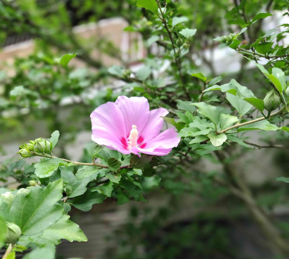 朝台所から📷したムクゲまだ咲き始めです‹‹\( ´▽`)/››〜♪ෆ¨̮ෆ¨̮