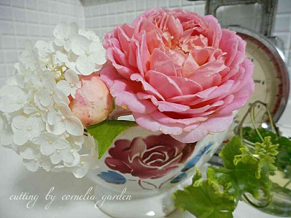カフェオレボールに飾ったのは大好きなジュビリーセレブレーションとアナベル*✲゚*。 ♪