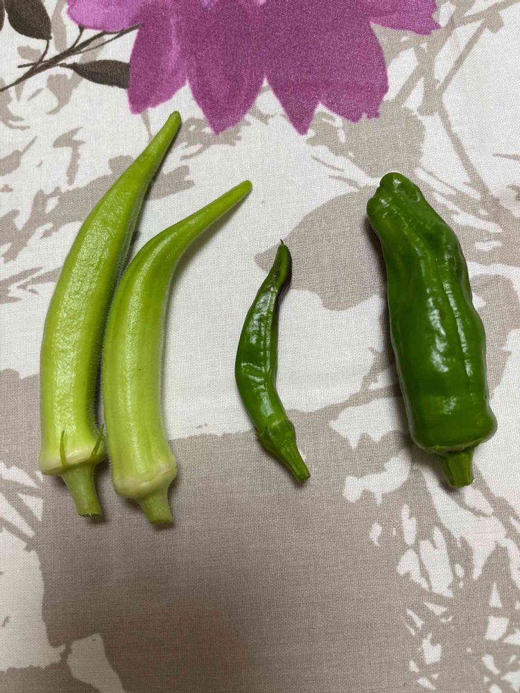 白オクラ2本と万願寺とうがらし2本採取しました🙏😊
