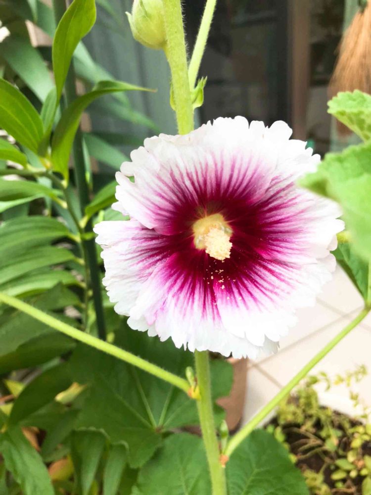 🥦近くで拝借した種からこんな色のタチアオイも咲きました!トロピカル🥤🏖💓✨赤 白 花の種がたくさん取れてます。この種 どうしようかな………