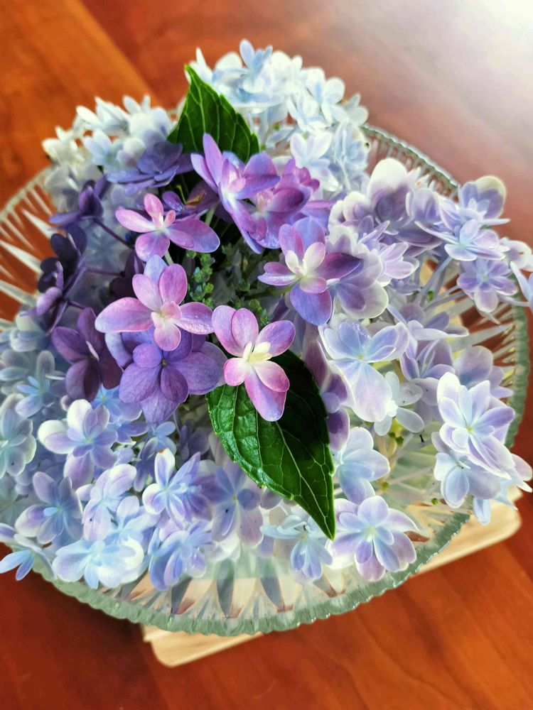 ミニトマト収穫のついでに見えないところに隠れて咲いていたアジサイをカットしてきました。汚れやナメクジなどをよく洗って落とし、水を張ったガラスの器に。いよいよアジサイは最後かな。