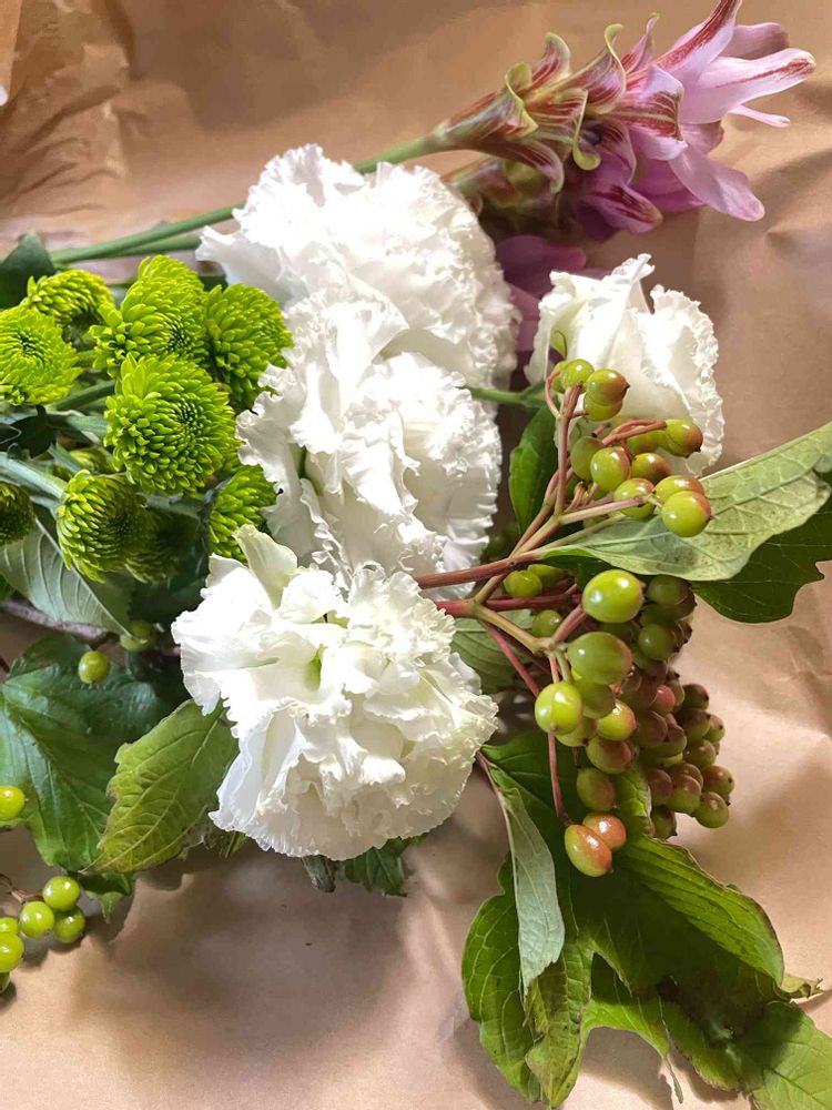 ビバーナムコンパクタ、クルクマ、リシアンサス、緑のマム