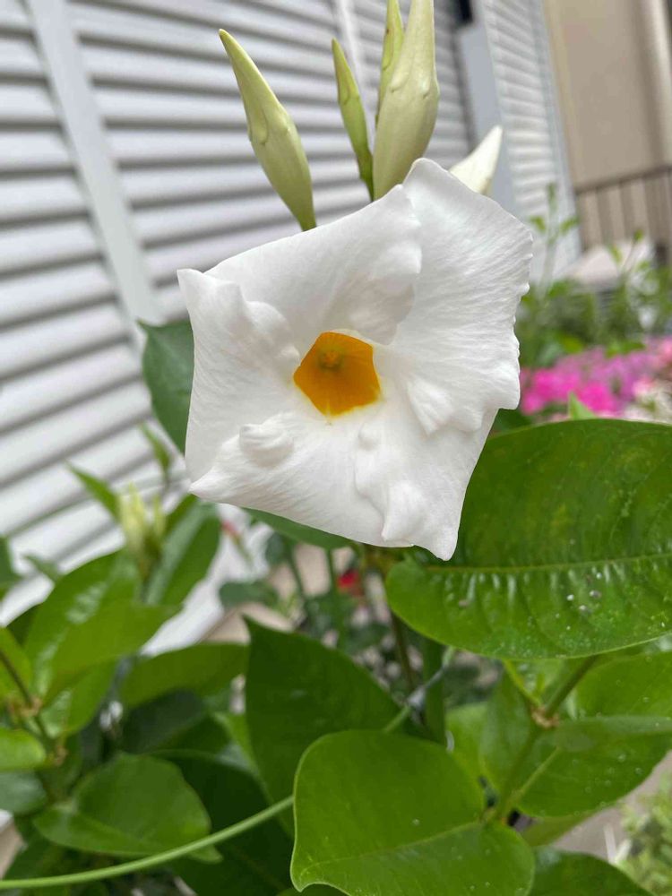 【アンバサダー便り】植え付けて約2か月半。株がしっかり整ってから、満を持して咲き始めた白のクライミングサンパラソル♪