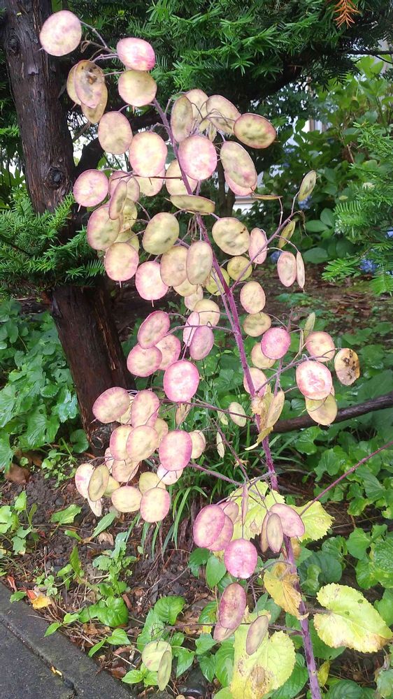こんにちは。春のムラサキ色の花から、緑色の小判に、そして今の色、更にこの後銀色の小判、雪にやられなければ翌年まで見られます。ご覧いただきありがとうございます。🌱🌱🎐