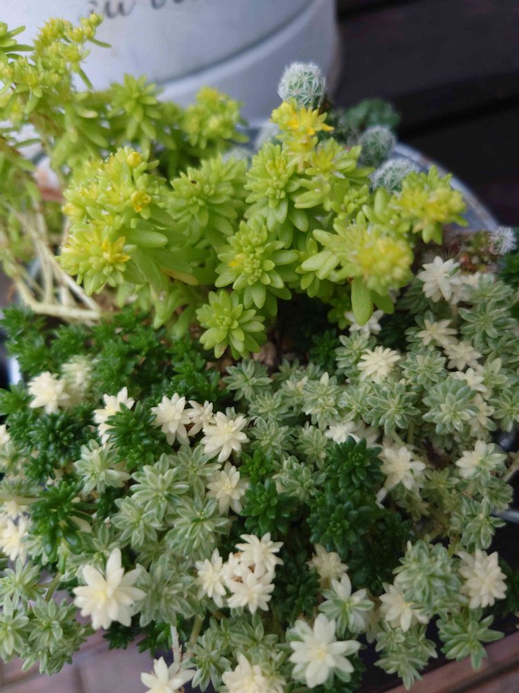 DAISOの小さなブリキ鉢に植えてほったらかしですが、ここのセダムたちは割と徒長せず元気そうです(*^^*)🩷