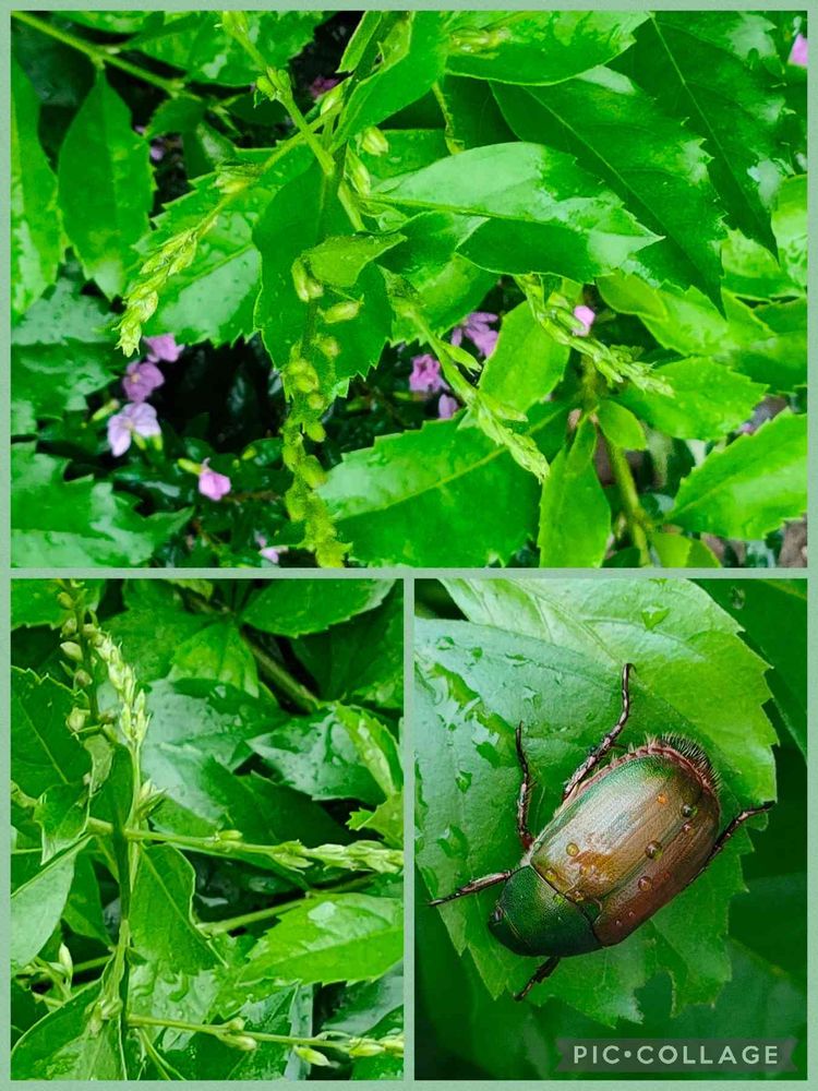 デュランタ蕾が出来始めているのにデュランタの葉っぱ🌿の上にコガネムシ😅テッシュでつかんでぽいしました😆‼️