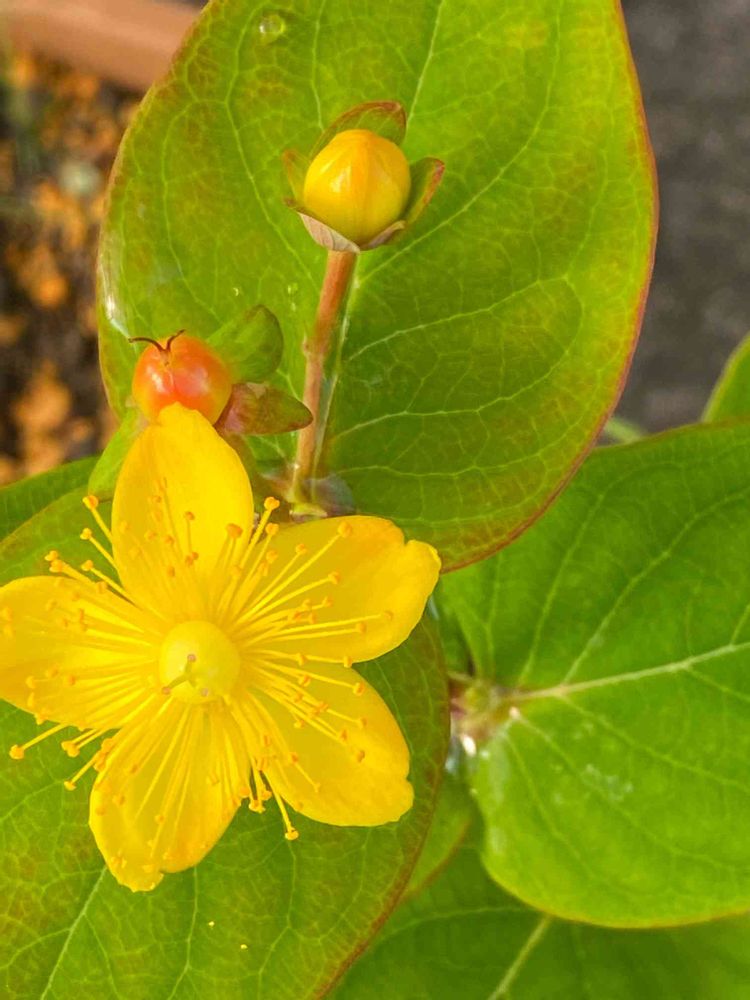 3月にいただいた花束💐の中に、可愛い赤い実のヒペリカムが、入っていました。挿し木をしたところ根付き、花🌼が咲きました💕