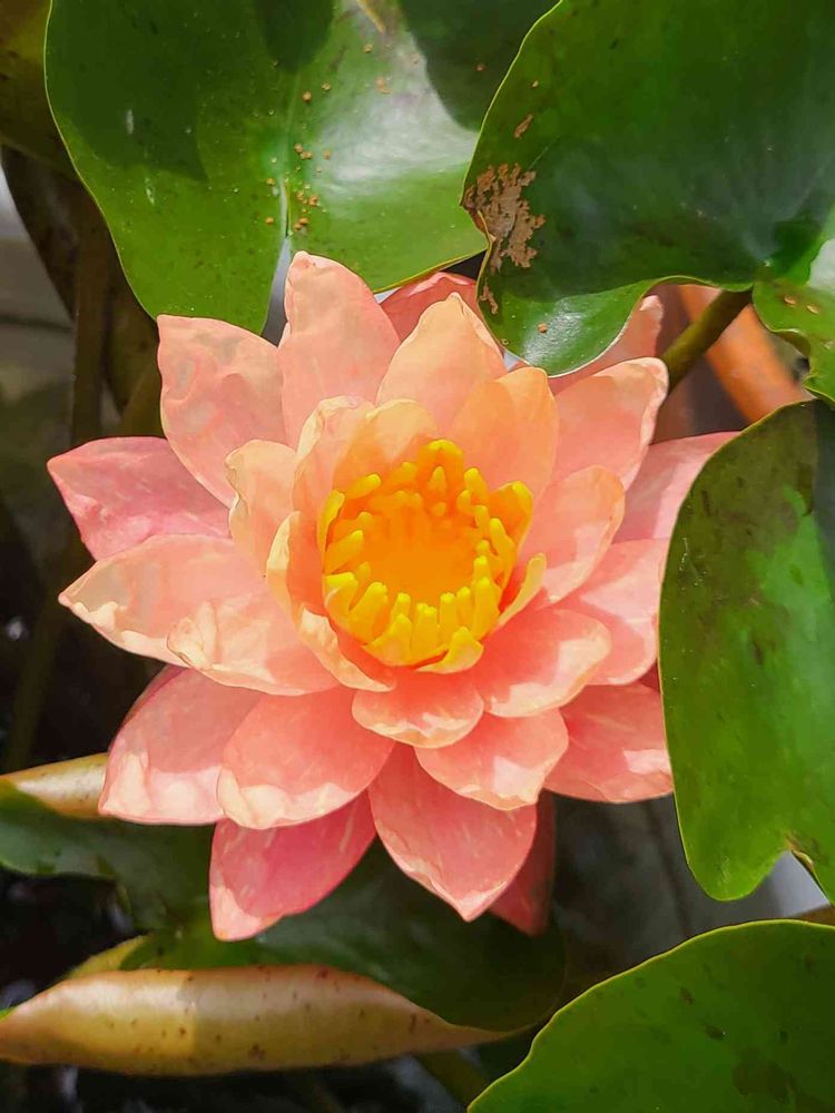 睡蓮のオレンジ珍しいですかね?ピンクや紫黄色などよく見る気がしますが👀葉っぱはカットするとまずいですかね?メダカの中の睡蓮葉っぱがいっぱいです💦😅