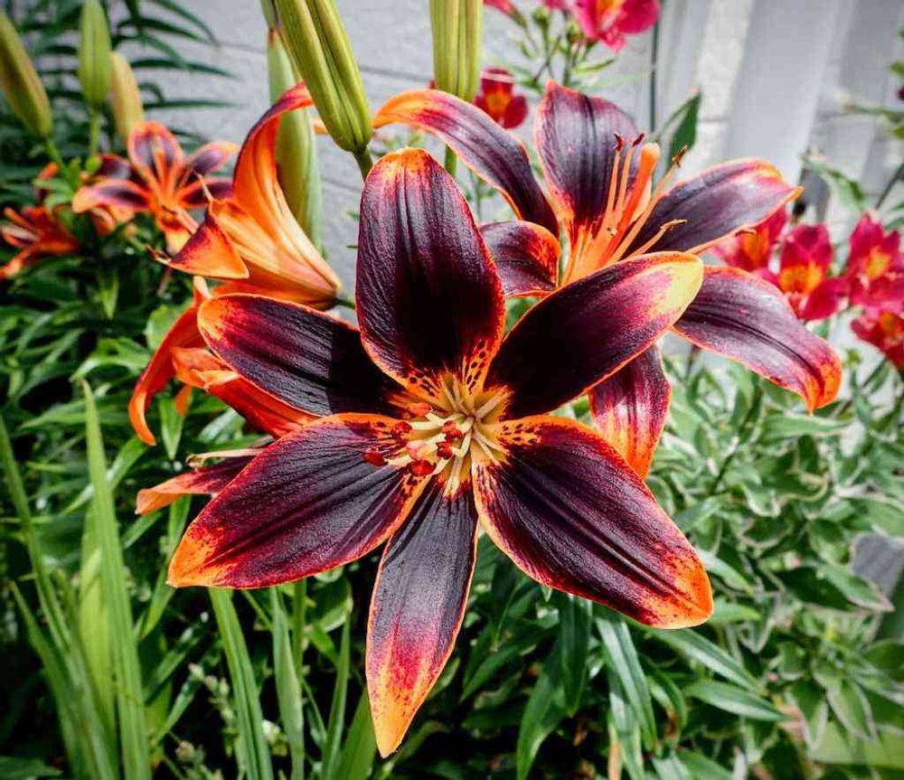 AH百合のフォーエバースーザンです😊濃いオレンジ色に黒に近い褐色の二色咲が強烈なインパクトですねー💕😍🖤😍🧡どこかのサイトで、昭和レトロな感じも・・と書かれていましたが、ワタシはどちらかというとモダン(死語かも~実にこの言葉こそ昭和レトロなのね^^;)な印象を持ったのはσ(^▽^;)も昭和の人間なので、あら素敵と思ったのかしら―ヾ(≧∇≦)ノ