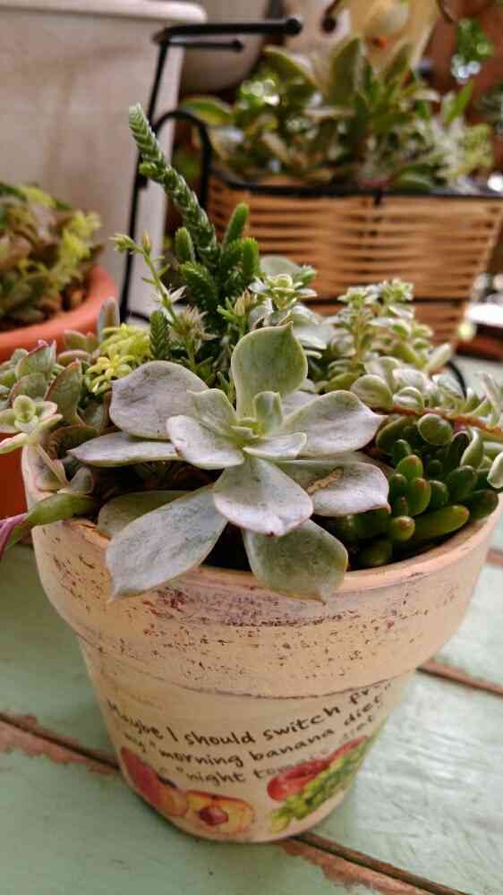 こんにちは。初めてのリメイク鉢に多肉ちゃんの寄せ植えをしました。