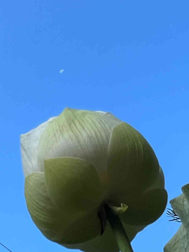 自宅の蓮が2本目開花、朝早くお天気でした。小さいですが月🌙が見えています。