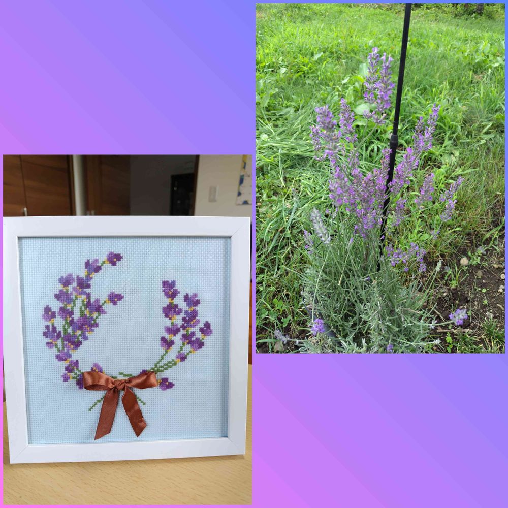 庭仕事が忙しくて、しばらくほったらかしにしてたラベンダーの刺繍とコラボしてみました💦