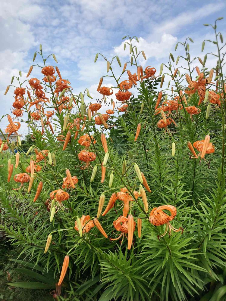 花パト。束の間の青い空?この後カミナリ大雨が降った😵新幹線の高架下のオニユリ。今年も咲きました。我が庭では、ここのMUKAGOから育ててます。まだまだ先は長い。