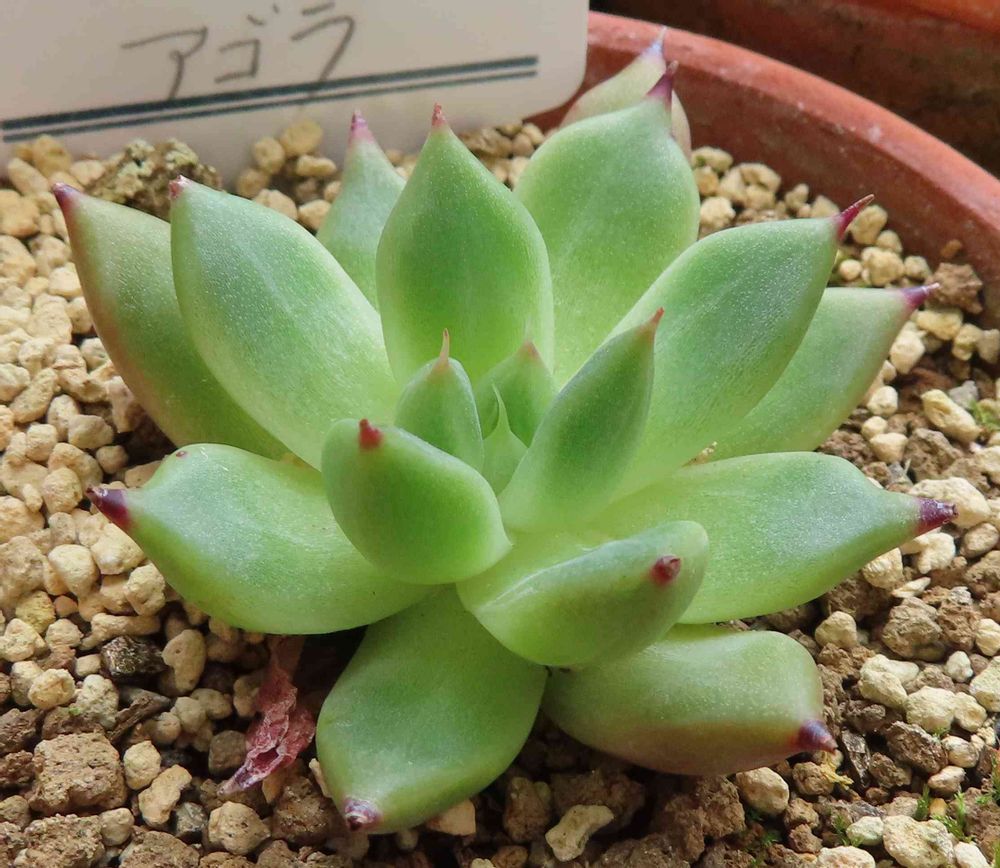 多くのエケベリアと同じく,夏は緑に戻ってしまうアゴラ。ただ,緑と言っても淡い黄緑色だし,表面のつぶつぶ模様のおかげか,きれいに見えてしまう。
