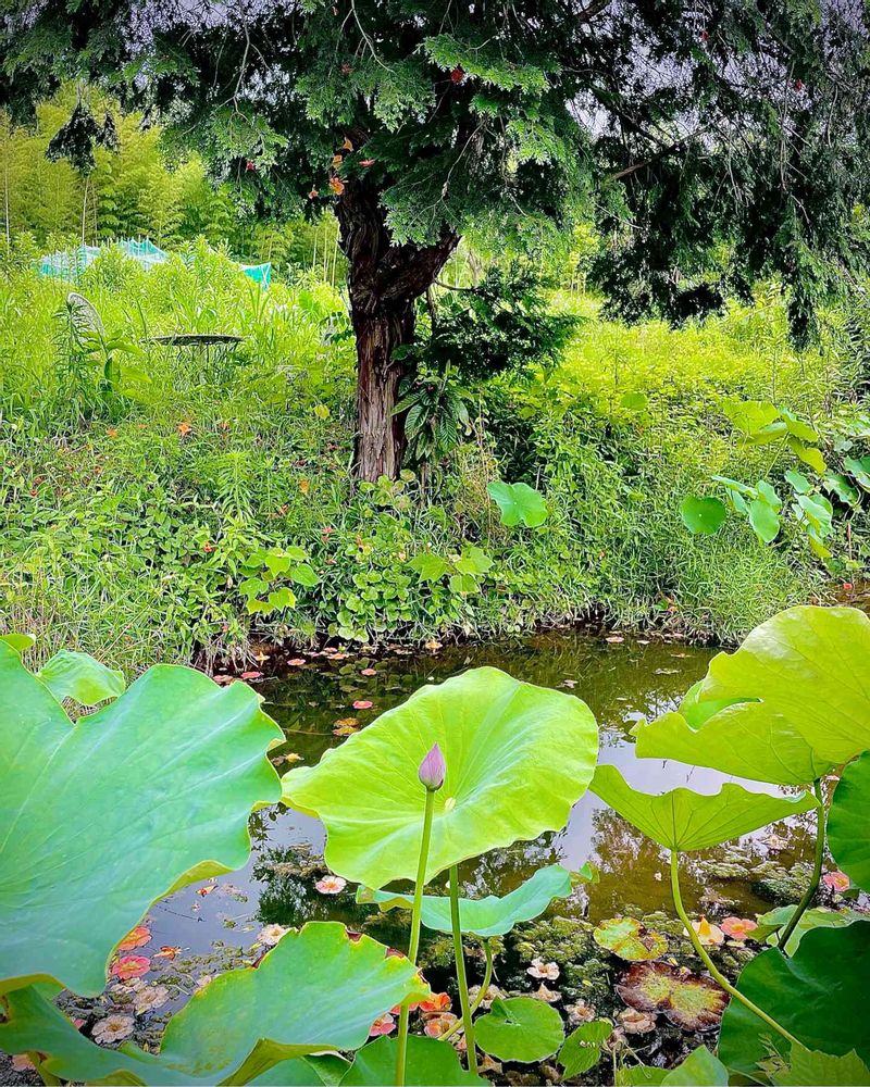 凌霄花の花浮かぶゲコゲコ沼に、ようやく蓮子の蕾が見え始めました。