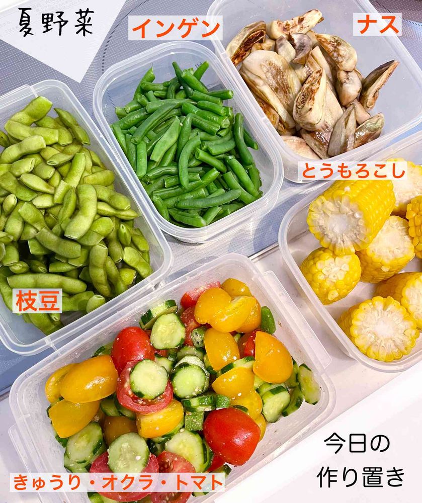 自家製野菜と義母からもらった野菜で作り置き。とうもろこし、甘くて美味しい😋