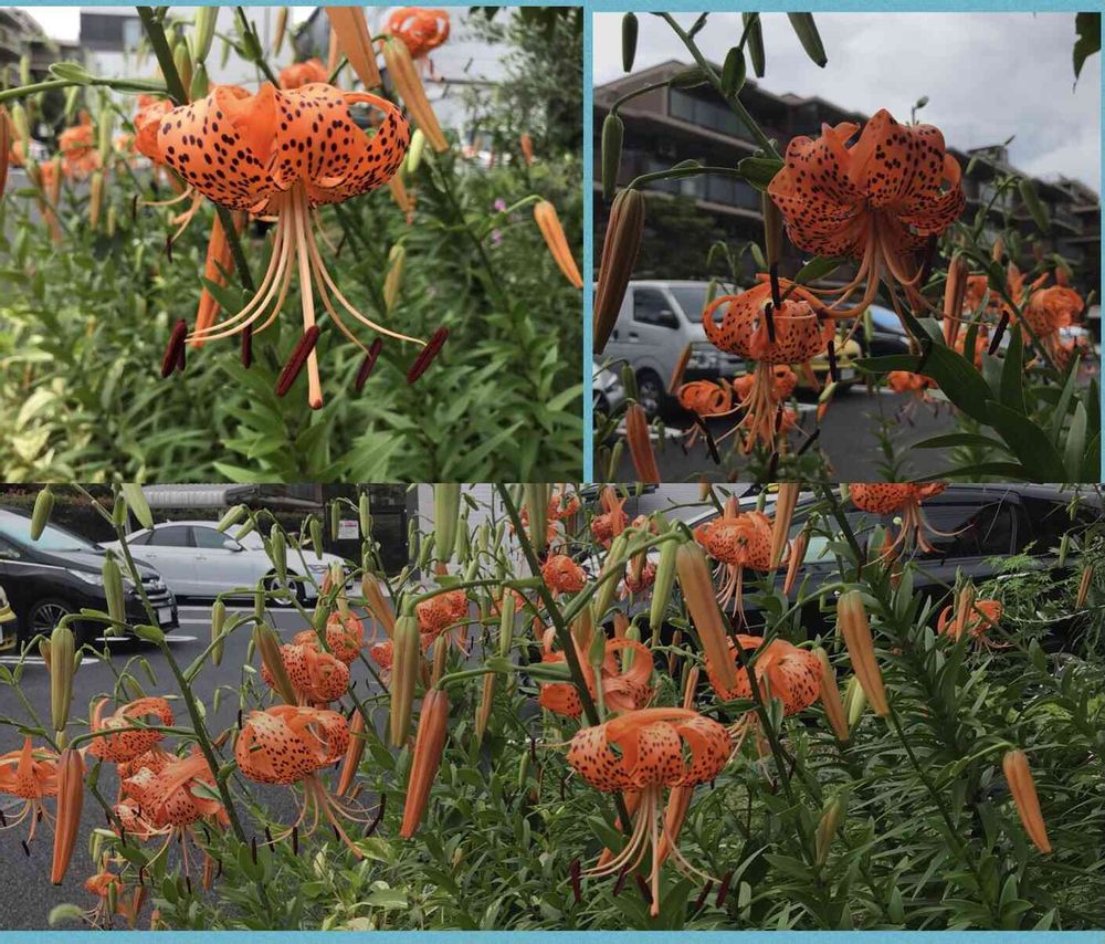 オニユリの花言葉はこの花がオレンジ色の鮮やかことから 「愉快」「陽気」「華麗」鬼百合の名前の由来は花の姿が赤鬼を思わせることから。ただ下向きな花で鬼👺の荒々しさは感じない。英名Tiger lily