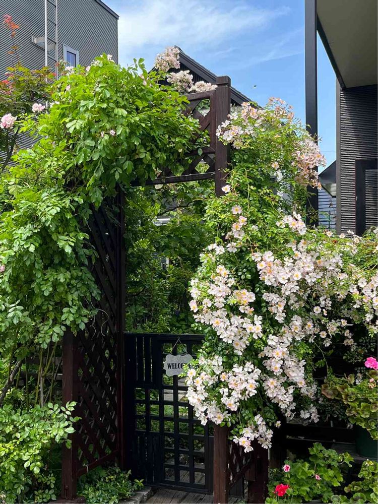 アーチの向こうは一人通れる位の石畳があって小さい花壇に好きな花を所狭しと植えてます😃そこで毎日あーでも無いこうでも無いと植え替えたりして遊んでますよー