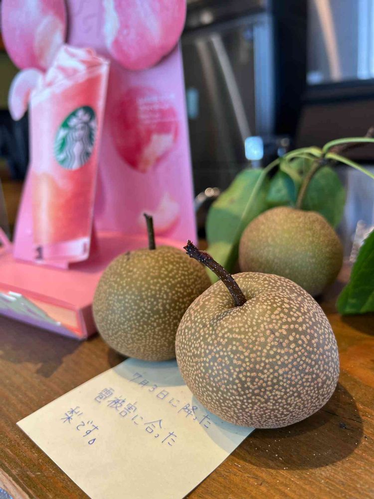 カプチーノを待っていたら、可愛い梨達が。この辺りは雹がよく降るそうです。お口で味わうことはなくなったけれど、こうして可愛い姿を目で楽しませてくれました。