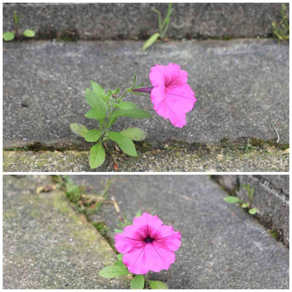 コンクリートの割れ目からペチュニア(サフィニア)が咲いているのに驚きです。