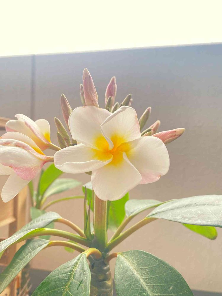 こんにちは、やわらかな色合いの可愛らしいプルメリアですね😌蕾もいい感じに成長しているので、ブーケ咲きすると良いですね!