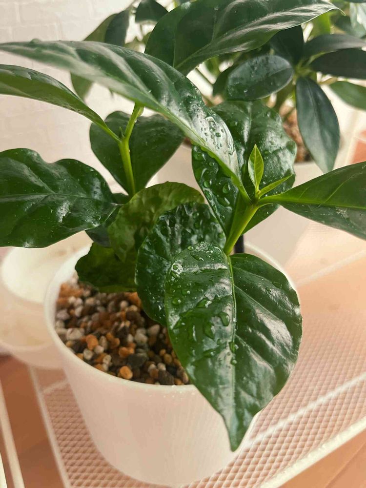 私もDAISOでコーヒーの木購入しました。植替えの時に3株に分かれてしまったのでいきなり3鉢に増えました😅😅😅。見たところこの子は双子?っぽいですね🥳