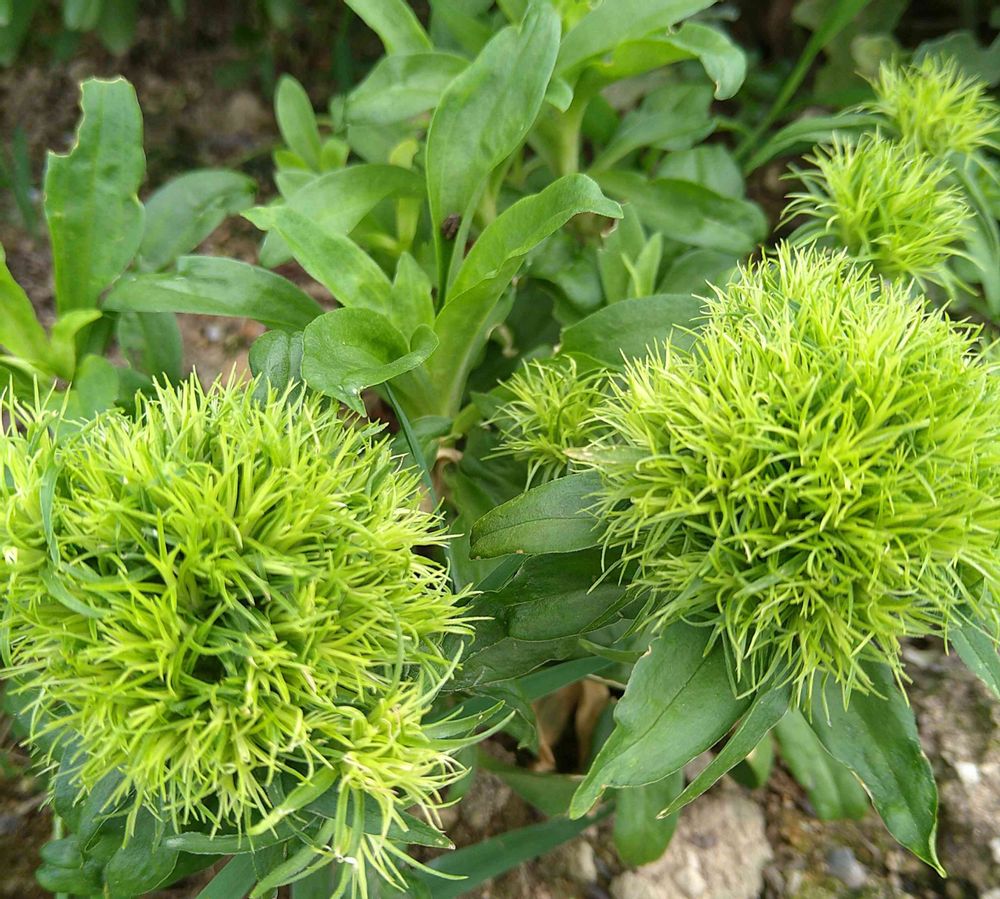 美女ナデシコの枝変わり種の珍しいダイアンサス。マリモのような緑色のボール状のお花です🟢🟢