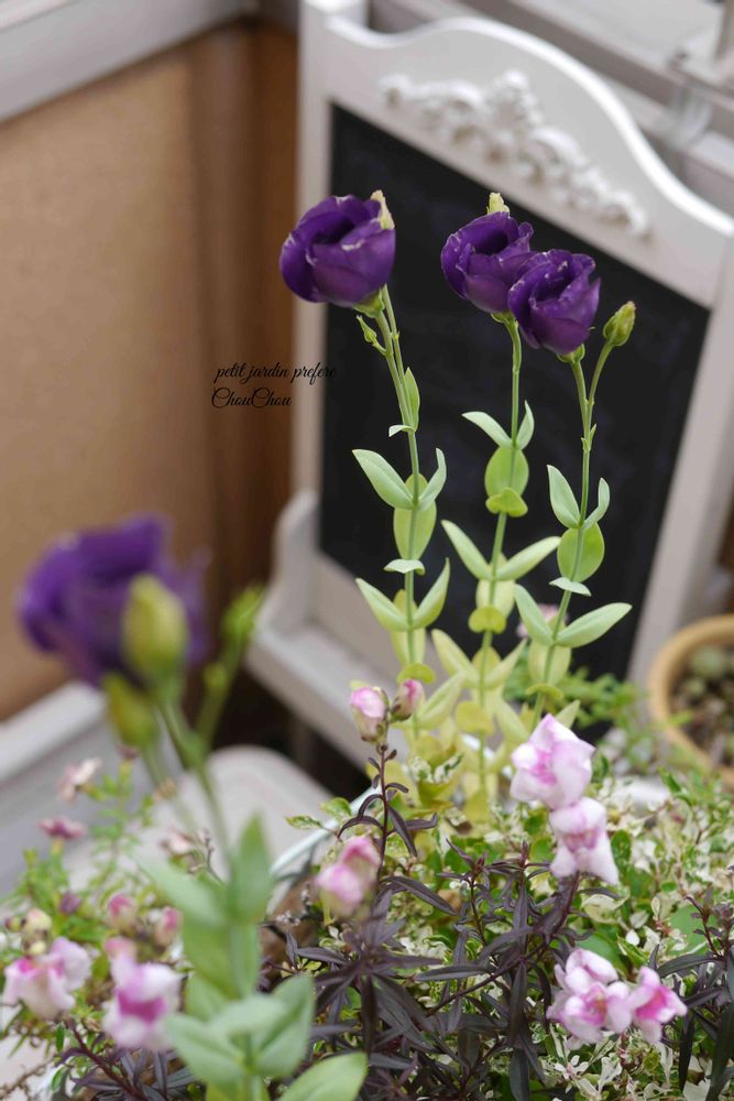 キキョウとキンギョソウの寄せ植え。キキョウは去年より、濃い紫になって咲いています。