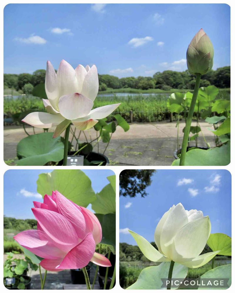 ハスと青空がとても素敵です。朝のうちに行くと良いとか、、、でも以前お昼頃行ったけど、綺麗に咲いてましたよ🤍💛💗🤍💛💗🤍💛💗