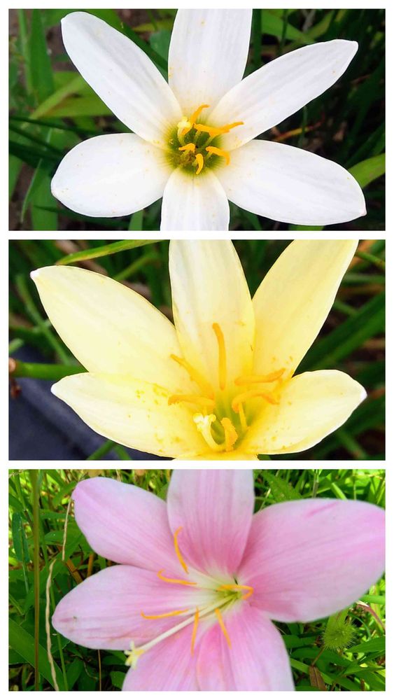 お隣の畑で咲いてる三色のゼフィランサス🤍💛🩷💚