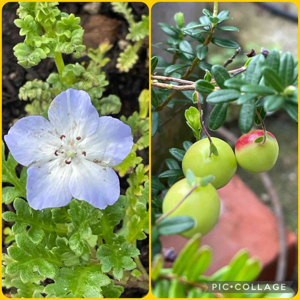 ネモフィラの花色も花姿も可愛らしいね🩵🌿❣️クランベリーが少し赤くなったのがとても可愛い🥰