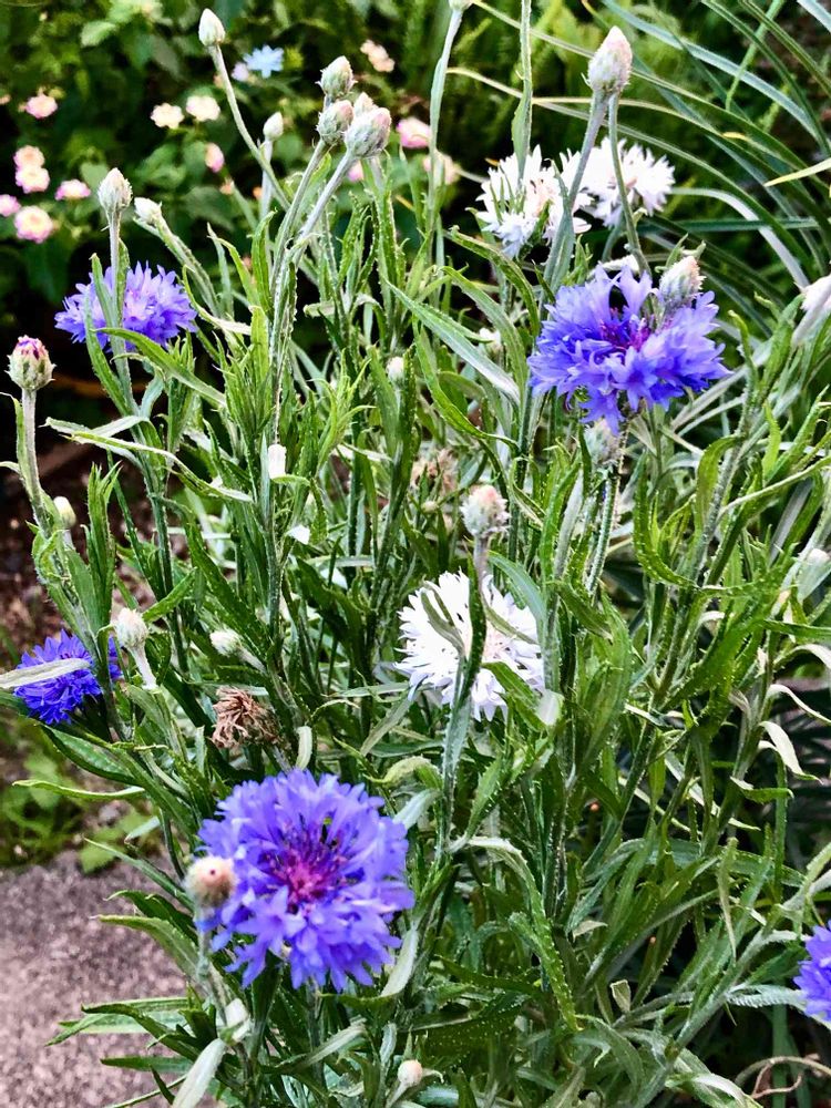 今日の私の1枚目は種子を蒔き育てた矢車菊です🤗💙🤍💜🤍💚💚