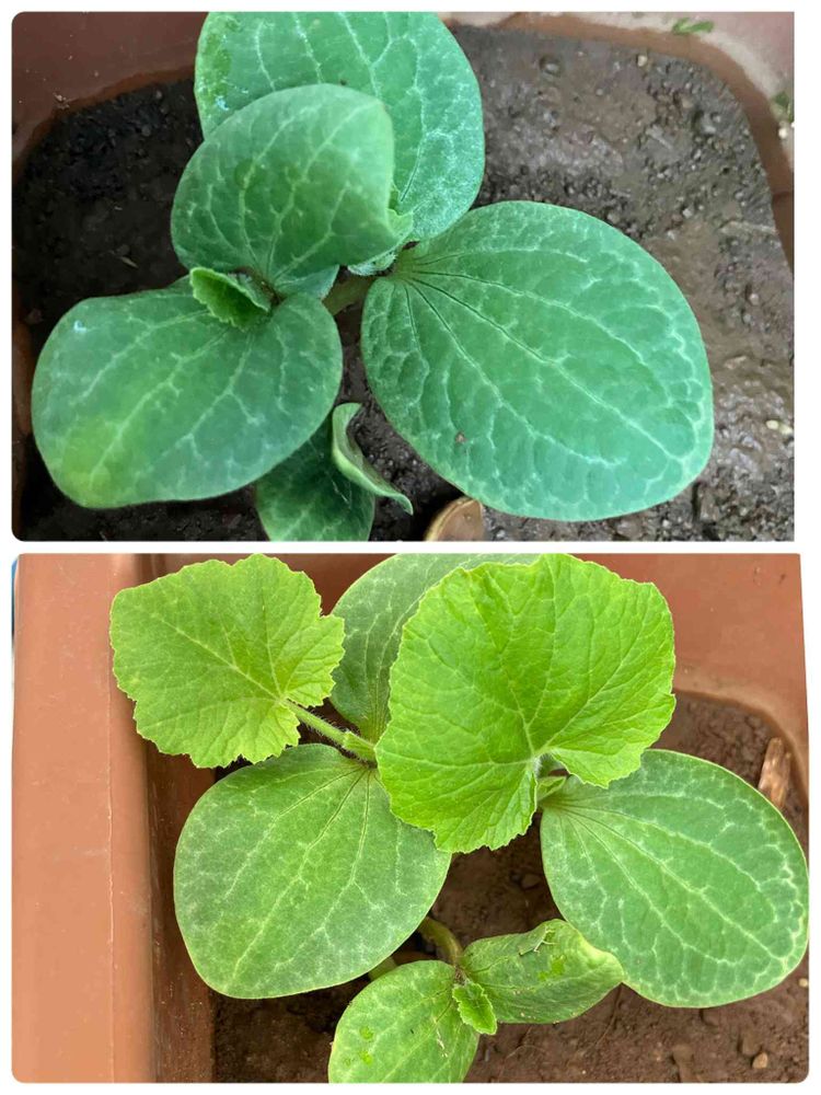 2日前の写真が上で下の写真は今撮ったのです。2日間でこんなに成長しているカボチャの芽🌱🎃です。