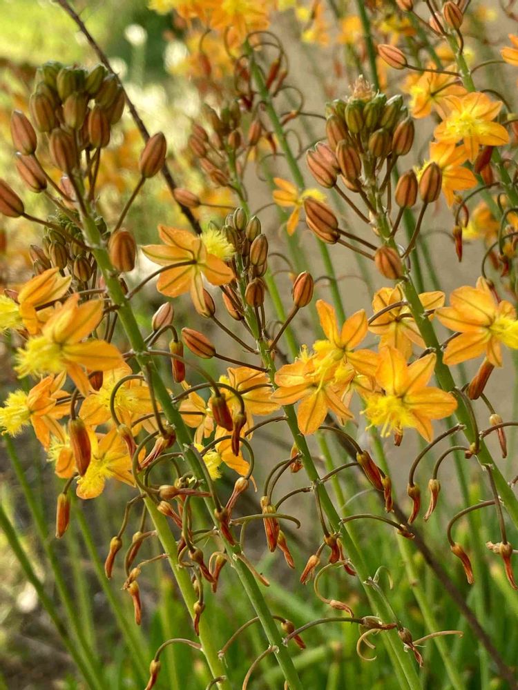 花茎の先に長さ15~30cmの総状花序を出し黄色~橙色の6弁花を多数つけます🌼