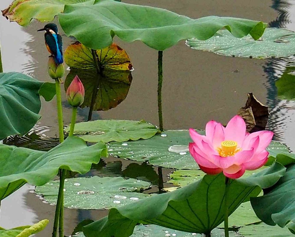 ハスのピンク色とカワセミさんの翡翠色が何とも言えません😍🎶。