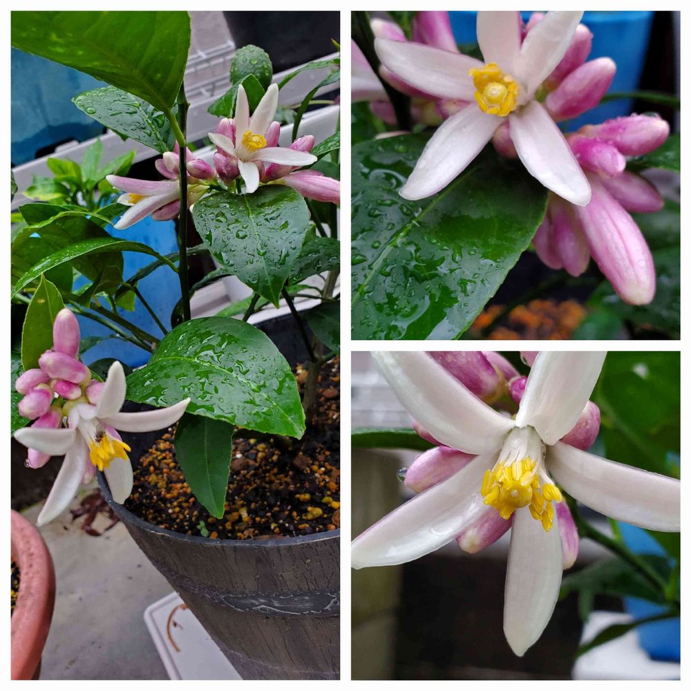 大雨特別警報の中レモンの花がパッと😃咲きました!
