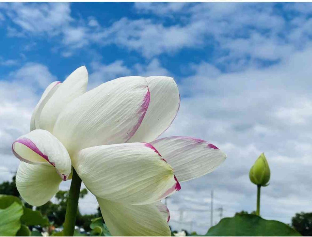 真っ白な花びらにピンク色の縁取りのオシャレなハスを横からパチリ✨