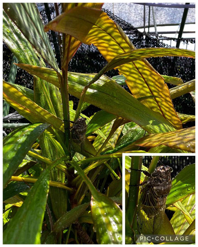 梅雨明け間近で例年より遅い蝉の声、数も少ないです。蝉さん日よけの下でひと休み、水やりしたら面倒臭そうに飛び立って行きましたよ。