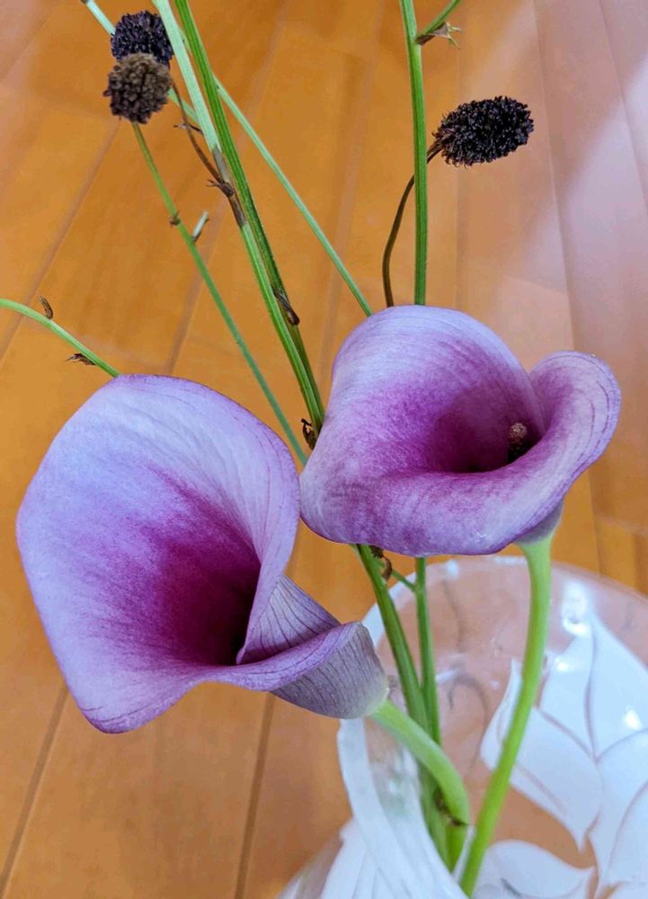 薄紫色のカラーとワレモコウの花が素敵ですね、今週のお花だったのですかラッキーですね🥰