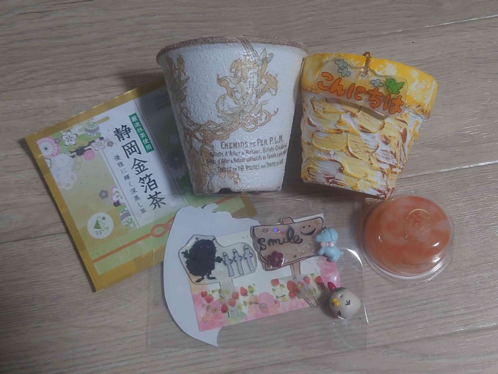 ぴーさんからプレ企画のお礼便が届いたよ😆🎁ちゅりさんのリメ鉢やピータン、まるでもなかのようなシルエットのわんちゃんがついた可愛いピックにお茶、おやつ😍盛りだくさんでうっとりです🥰💖ぴーさん、忙しいのにありがとうごさまいました🍀✨